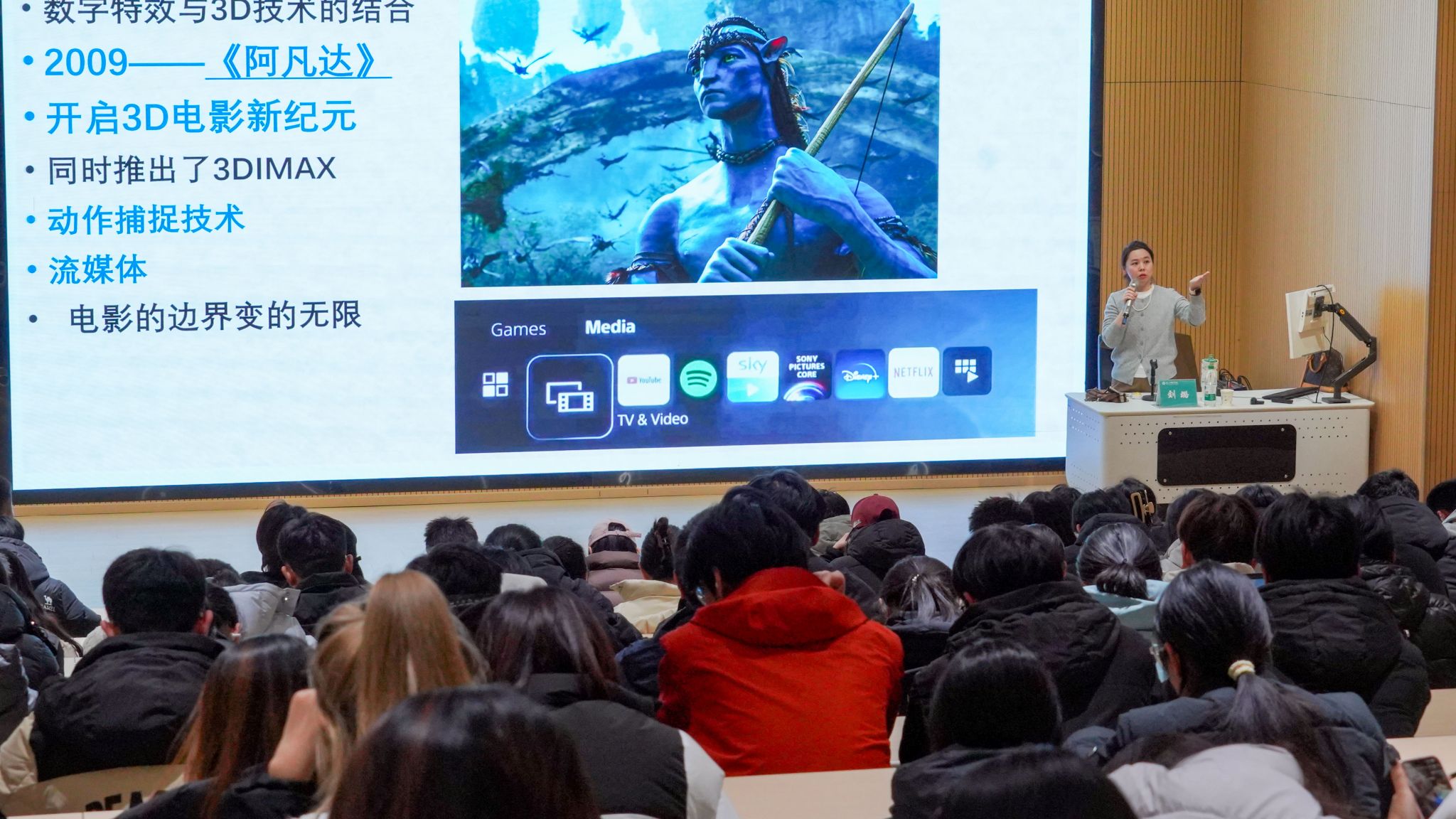 刘教授围绕观众地位转型展开阐述,强调融媒体时代下,沉浸式体验与新媒体即时互动,让观众从被动接受者转变为审美参与者,技术、媒介与内容共同构建起全新审美逻辑。通过微缩模型拍摄在科幻片场景构建中的实践案例,刘教授具象化呈现技术对审美表达的赋能,同时引导学子辩证看待电影艺术与商业价值的关系,培养独立审美判断能力,助力提升文化审美素养。