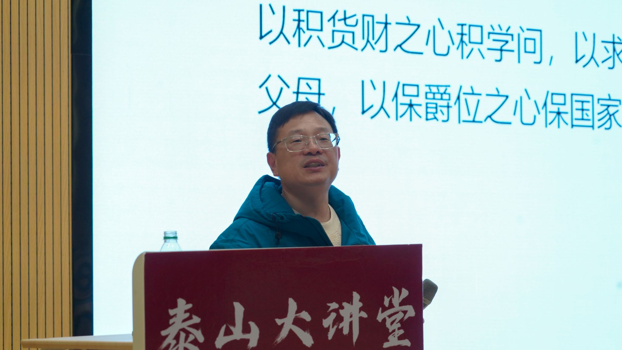 在全球化浪潮与学科交叉日益成为主流的今天,古典文脉如何与学科智慧碰撞出新的火花?12月4日,名师课堂办公室特邀黄永锋教授莅临泰山大讲堂,开启名师课堂选修课程“国学智慧与学科融合”的专题系列讲座。黄永锋教授结合校园学习、生活、人际交往等场景,为师生呈现了一场传统文化与当代校园的深度对话,让国学智慧成为滋养成长的鲜活养分。