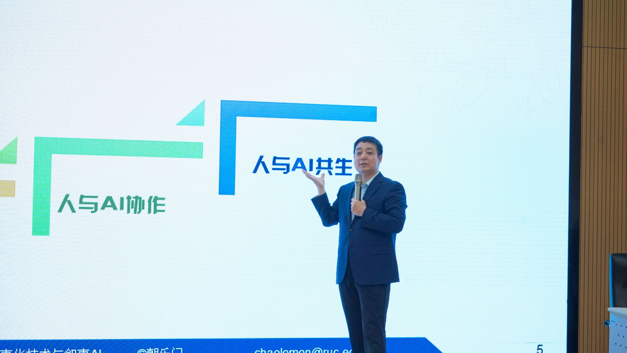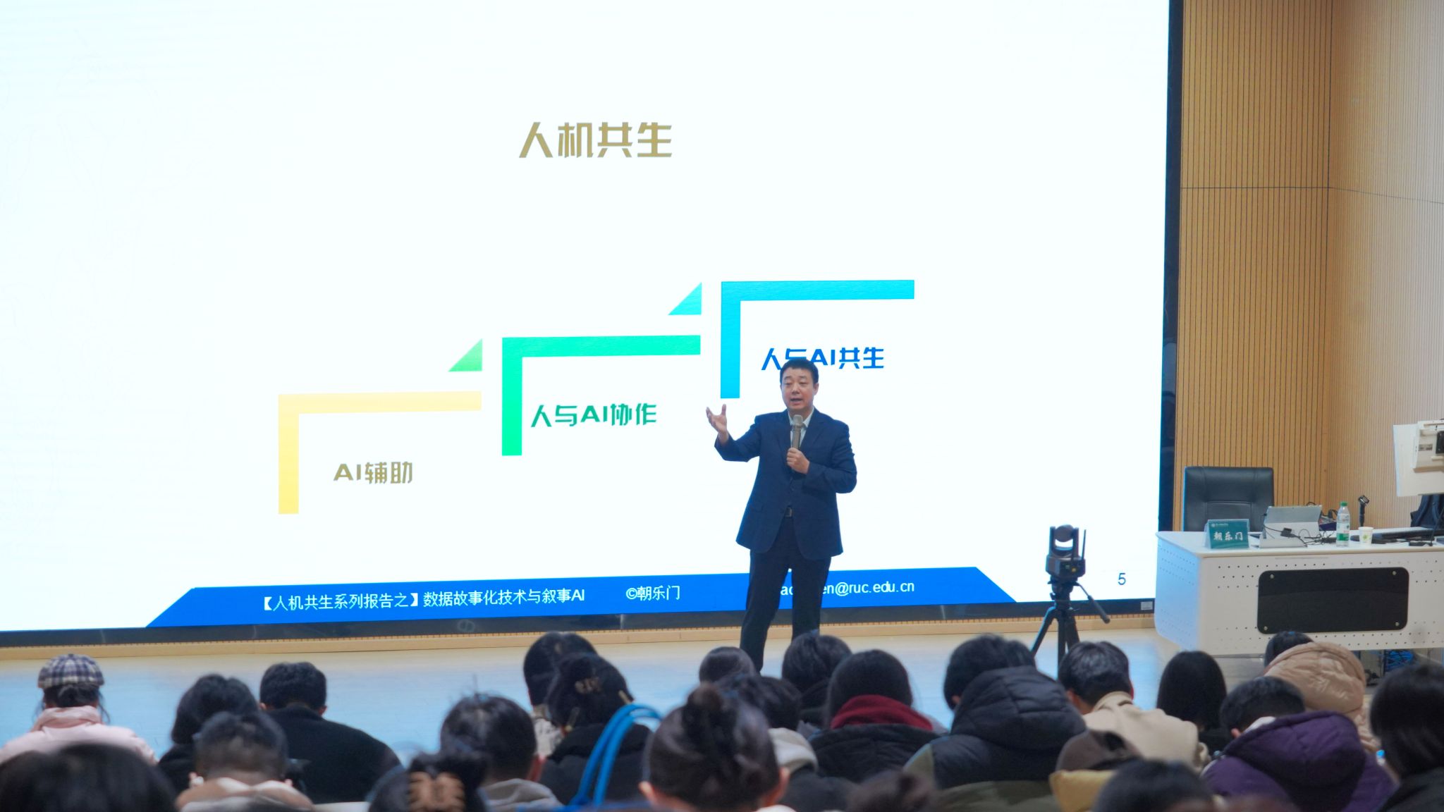 当大型语言模型深度融入学习、科研与工作场景,我们将如何合理利用AI提升自身能力?12月18日晚,名师课堂办公室邀请到中国人民大学朝乐门教授做客泰山大讲堂,于2教名师报告厅为我们带来《人机共生:AI驱动型跨专业知识融会与创新实践》名师课堂选修课程,直面AI时代的认知挑战,系统梳理人机关系从辅助、协作到共生的演进脉络,以数据故事化技术与叙事AI为核心,为跨专业知识融合与创新实践提供了全新解决方案。