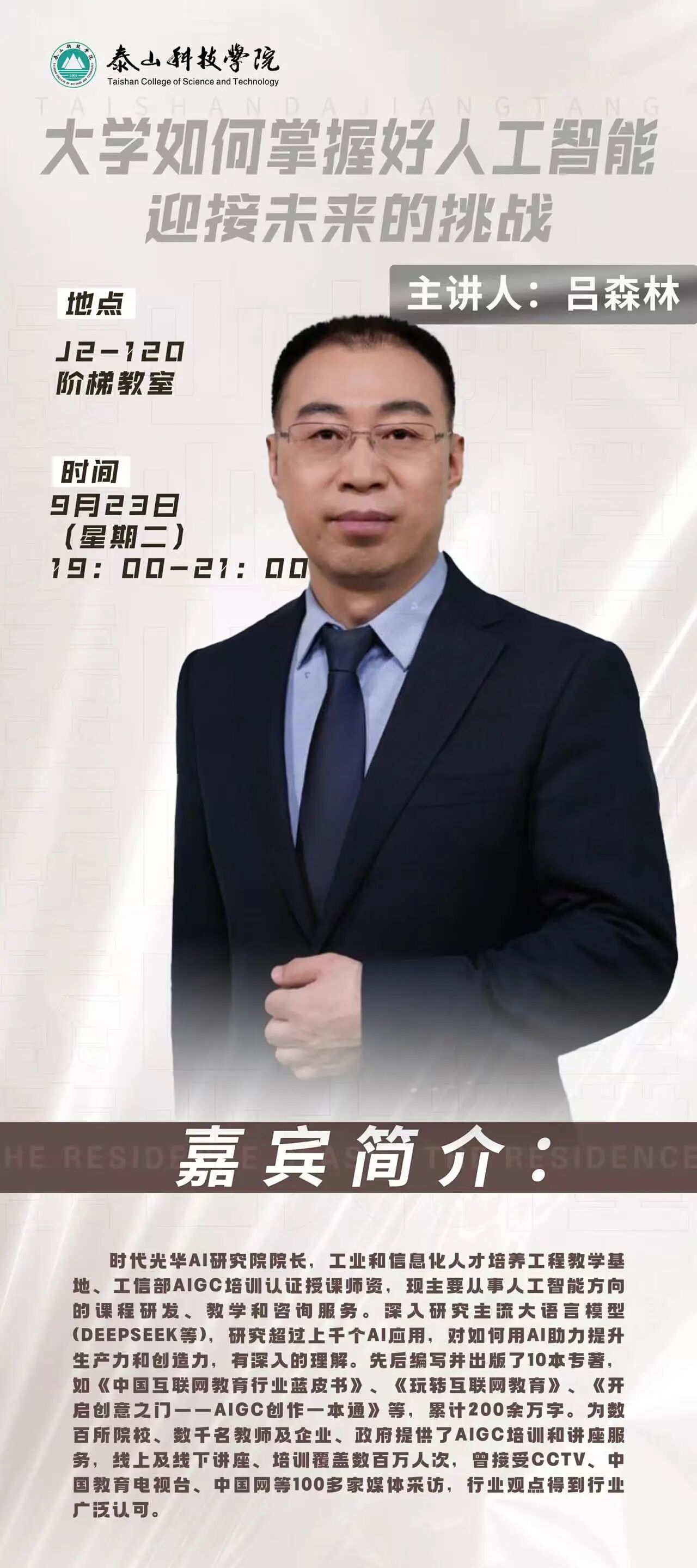 吕森林,时代光华AI研究院院长,工业和信息化人才培养工程教学基地、工信部AIGC培训认证授课师资,现主要从事人工智能方向的课程研发、教学和咨询服务。深入研究主流大语言模型(DEEP-SEEK等),研究超过上千个AI应用,对如何用AI助力提升生产力和创造力,有深入的理解。先后编写并出版了10本专著,如《中国互联网教育行业蓝皮书》、《玩转互联网教育》、《开启创意之门--AIGC创作一本通》等,累计200余万字。为数百所院校、 数千名教师及企业、政府提供了AIGC培训和讲座服务,线上及线下讲座、培训覆盖数百万人次,曾接受CCTV、中国教育电视台、 中国网等100多家媒体采访,行业观点得到行业广泛认可。