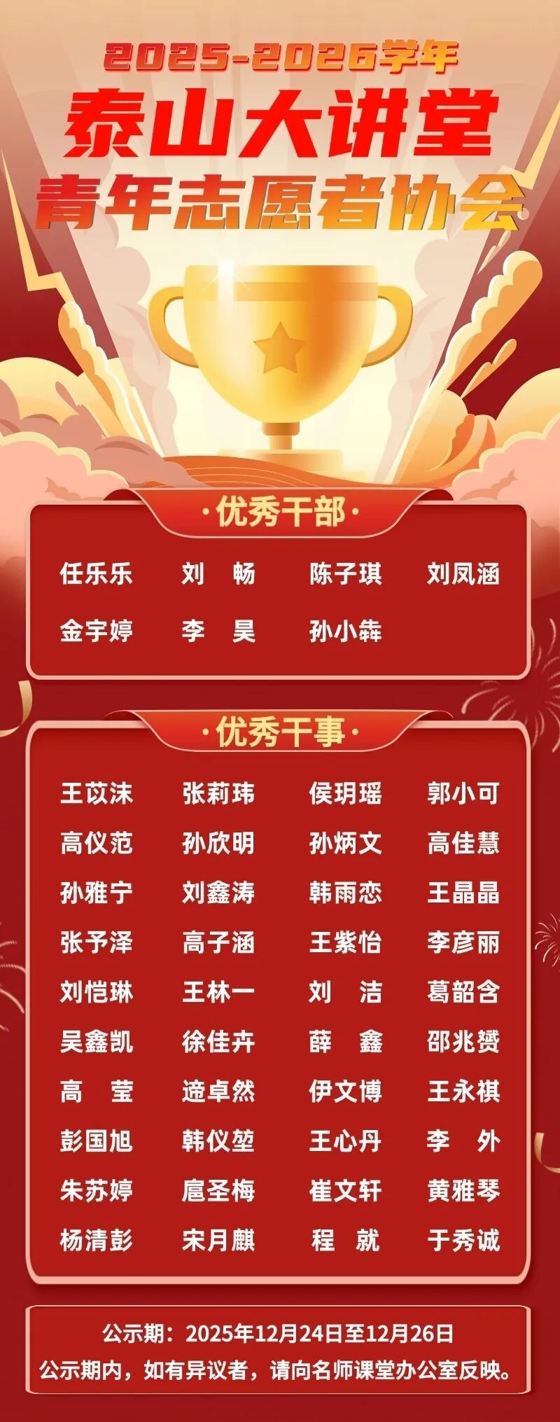 为确保评优工作的公平、公正、公开,泰山大讲堂青年志愿者协会年度评优工作严格遵循“自主申报、材料审核、现场答辩”的评选流程开展。经个人提交申报材料、评审团综合审核、候选人现场答辩展示,最终确定本年度优秀干部、优秀干事等荣誉名单。